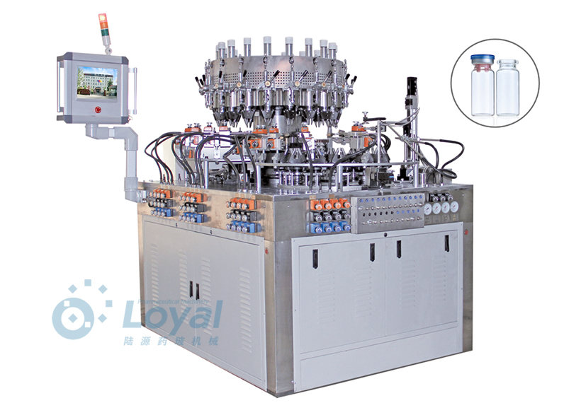 西林瓶生產線包括:自動上管、自動成型、經機械手轉換至前端檢測線(也叫生產管控)、檢測線檢測的項目:1、瓶口內外徑 2、瓶身長短 3、瓶身外徑 4、瓶口邊厚 5、瓶底內凹尺寸檢測;經檢測后的合格品再用機械手夾盤轉換至退火爐網帶上,經高溫減除應力后再降溫,通過氣動吸盤將回火后的小瓶轉換至后端檢測線,后端檢測(也是重檢也叫終檢),經后端拍照檢測項目
